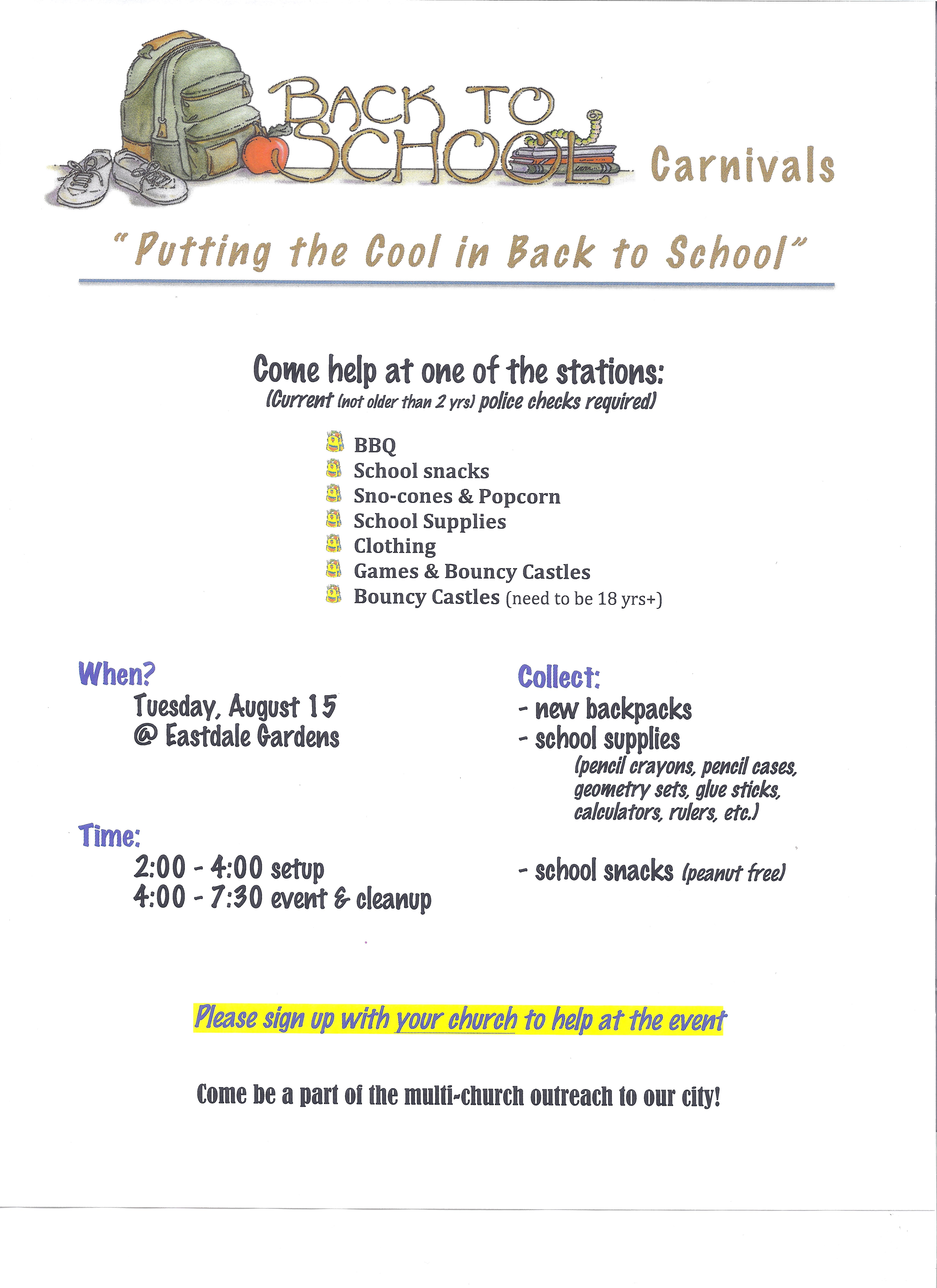 Aug 15 Tue August 15, 2017 at 4:00-7:30 p.m. Back to School Carnival Eastdale Gardens, Brantford Shenstone Baptist Church shenstone@bellnet.ca 519-756-2870